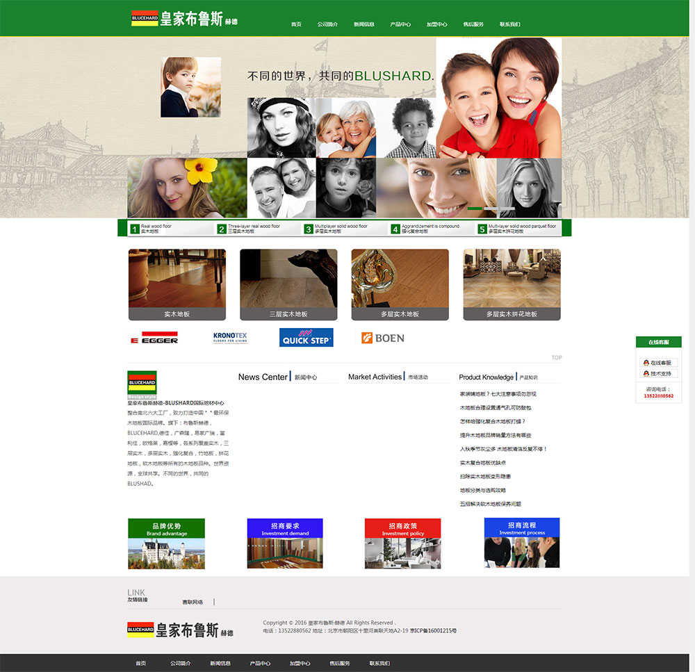 皇家布魯斯赫德-BLUSHARD國際地材中心整合南北六大工廠,致力打造中國**很環(huán)保木地板國際品牌。旗下:布魯斯赫德,BLUCEHARD,德佳,廣森隆,易家廣瑞,富利佳,歐格萊,嘉櫻等,各系列覆蓋實木,三層實木,多層實木,強化復合,竹地板,拼花地板,軟木地板等所有的木地板品種。世界資源,全球共享。不同的世界,共同的BLUSHAD。